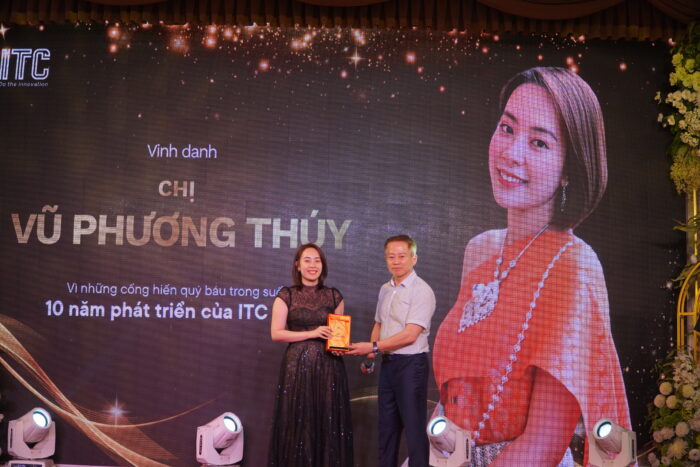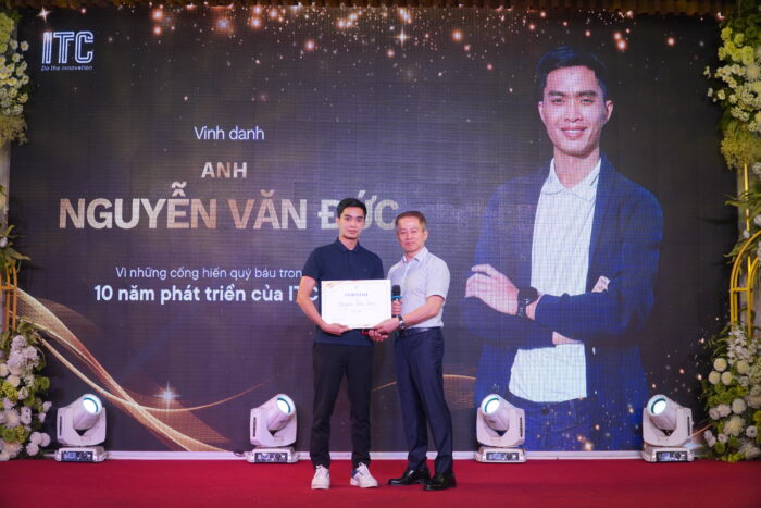 Mở đầu cho phần vinh danh trong đêm Gala là lễ tri ân những nhân sự đã gắn bó trọn vẹn 10 năm cùng ITC. Với một doanh nghiệp đã bước qua 30 năm hình thành và phát triển, hành trình 10 năm gắn bó của mỗi nhân sự là một chặng đường đáng trân trọng – nơi họ không chỉ kiên trì vượt qua nhiều thăng trầm mà còn trực tiếp góp phần tạo nên ITC JSC hôm nay.