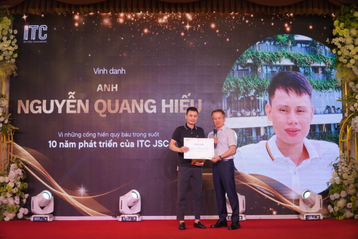 Trong không khí trang trọng và đầy cảm xúc, các cá nhân được xướng tên, nhận kỷ niệm chương và bảng vinh danh do chính Chủ tịch HĐQT ITC JSC – ông Nguyễn Quang Sơn trao tặng. Lễ vinh danh như một lời ghi nhận sâu sắc cho hành trình cống hiến bền bỉ, tinh thần trách nhiệm và sự đồng hành lâu dài với sự phát triển của công ty.